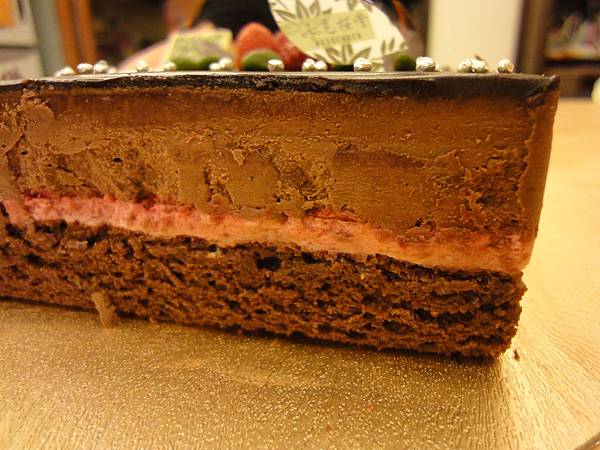 上方是濃厚的巧克力風味,中間是較酸的覆盆子莓(也不是軟趴趴的幕斯喔),下層是巧克力風味較濕潤的蛋糕體